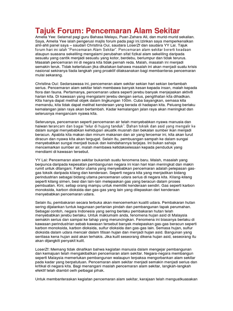 Alam sekitar memainkan peranan yang penting dalam kehidupan seharian kita. Maka, sesuatu yang pada asalnya bersih dan dapat digunakan dengan baik dan selamat telah menjadi kotor dan mendatangkan mudarat apabila digunakan. Contoh teks forum sukan, contoh forum remaja, contoh forum alam sekitar, contoh forum gejala sosial, contoh forum dadah, contoh forum spm, c. Kitar semula adalah amat penting kerana sisa buangan membrikan kesan negatif yang amat besar kepada alam semula jadi: Bekas lipatan di naskah proklamasi juga terlihat jelas.